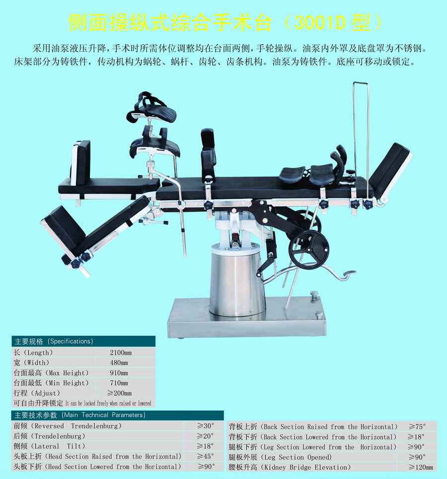 3001D型综合手术台供医院手术室施行头、颈、胸腹腔、会阴及四肢等外科、妇产科、五官科、骨科等手术用。