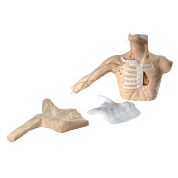 ■模型为成人上半身躯干、右侧上臂至腕部。体表标志明显,包括:胸骨上切迹、胸锁乳突肌、锁骨、肋骨。